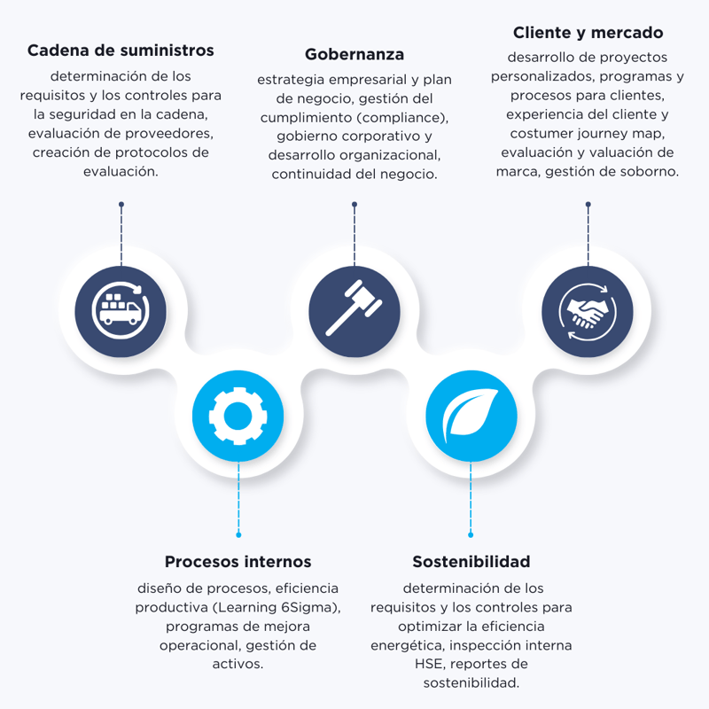 Por medio de un modelo de excelencia operacional integral, se brindan soluciones cuando un documento normativo, una certificación o capacitación, no son suficientes para satisfacen las necesidades identificadas.